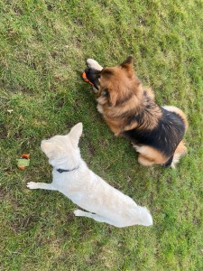 Me played ball, me sniffed grass and Bear, me ran, me was close to Bear, no growls, no issues. Sometimes when dad threw ball me didn’t see where it went but Bear did. Bear went and stood by it for me to see.