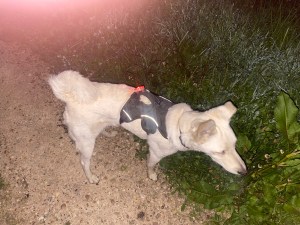 No day time walks today, but dad took me out at night time. It’s fun in the dark – me harness has a flashing light on so dad can see where me is hiding 🙂.